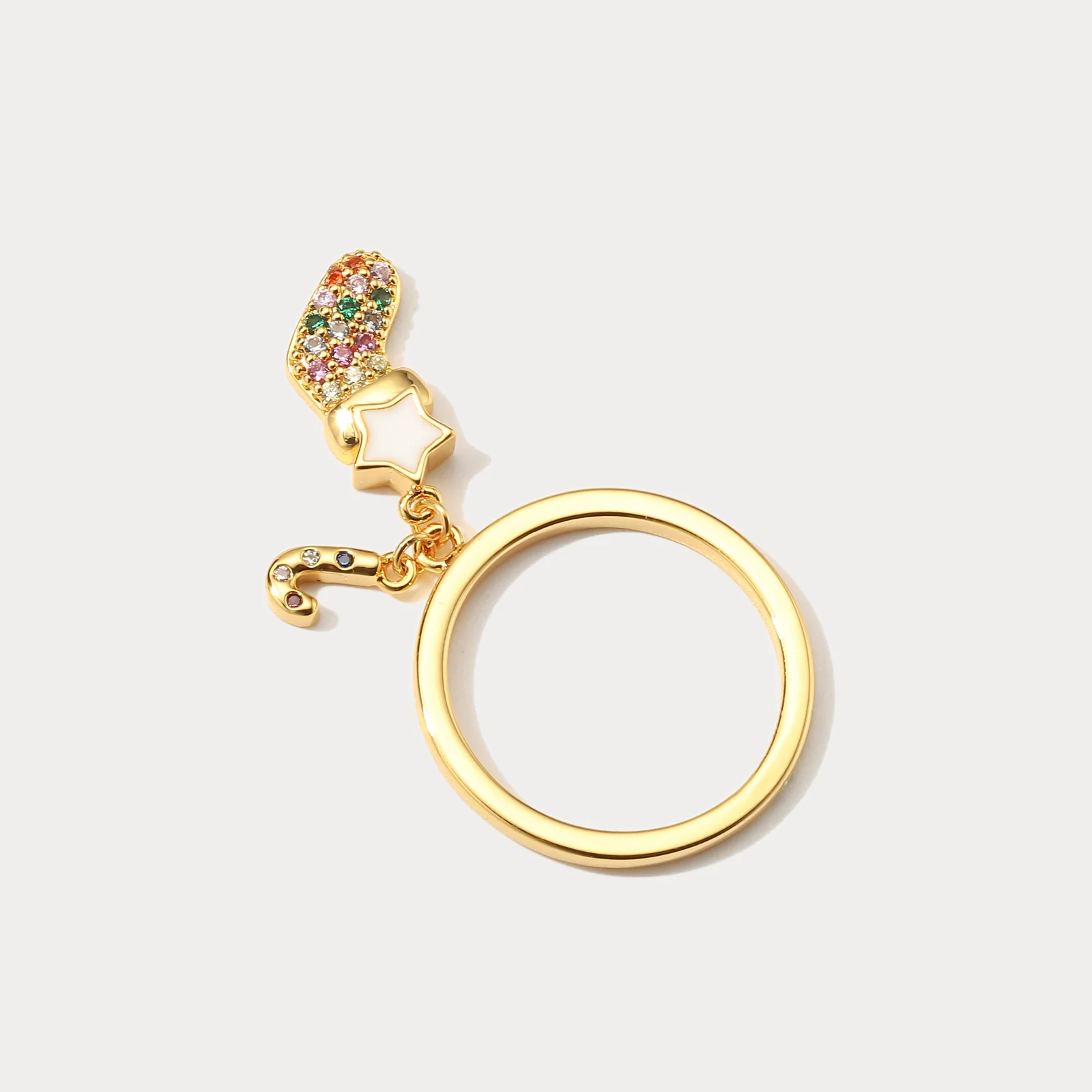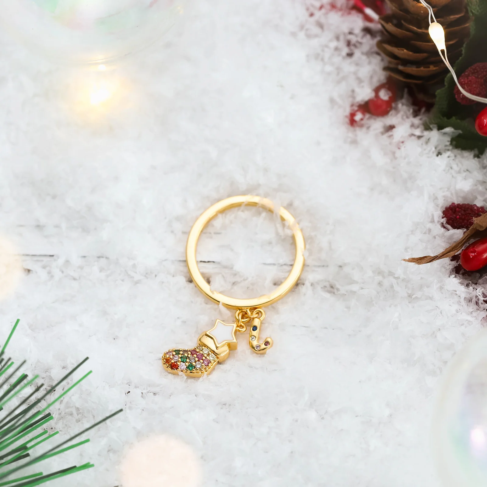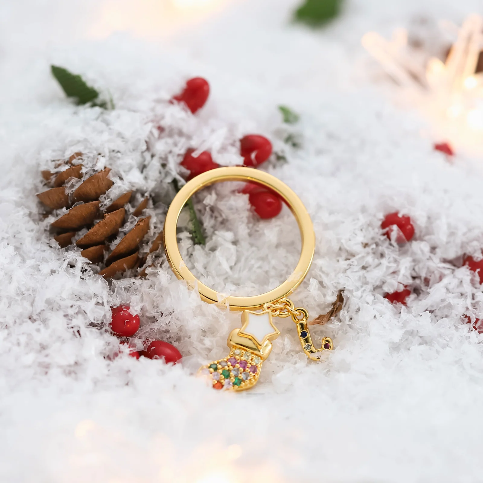 This delightful Christmas-themed ring exudes charm and festive spirit, making it the perfect accessory for the holiday season. The design features a miniature stocking adorned with vibrant, multi-colored rhinestones and a delicate enamel star, creating a whimsical and joyful aesthetic.