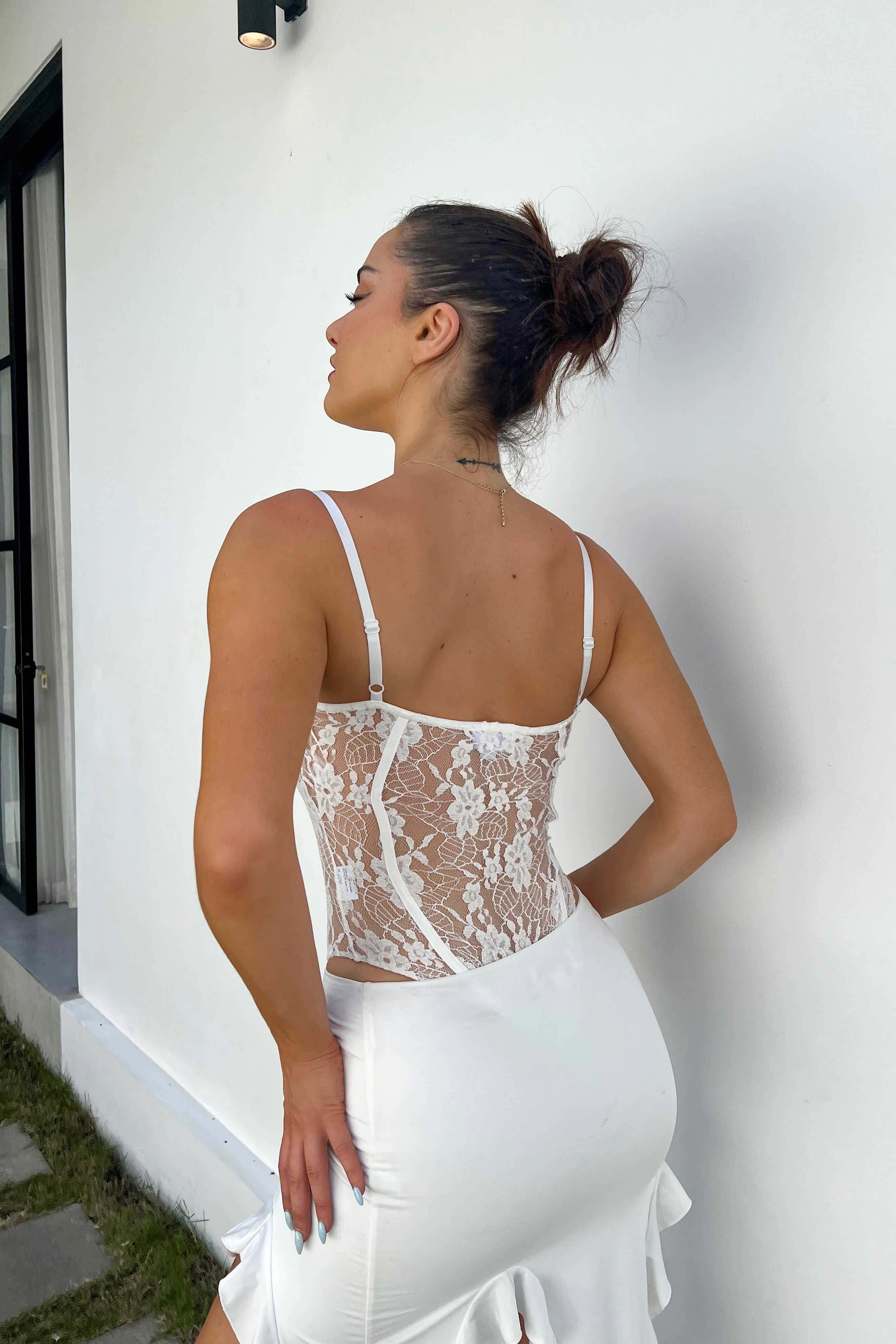 The upper section boasts intricate lace detailing, providing a feminine and sophisticated look. The lace is made from a durable blend of nylon and spandex, offering a slight stretch for comfort and ease of movement. Below the lace bodice, the skirt flows gracefully, designed from high-quality polyester, known for its wrinkle resistance and durability.