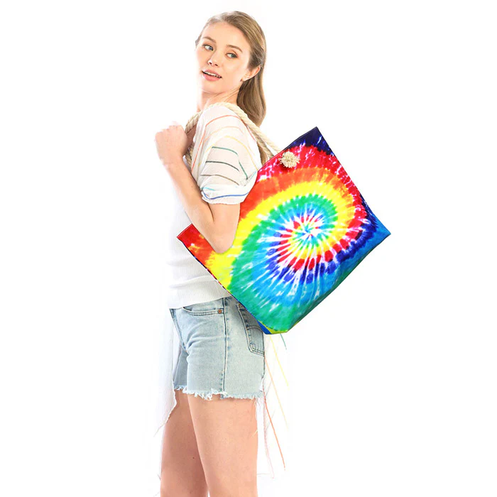 This vibrant tote bag is the perfect accessory for those who love to make a statement with their style. It features a unique tie-dye pattern that swirls in a spectrum of colorful hues, instantly adding a playful touch to any outfit.