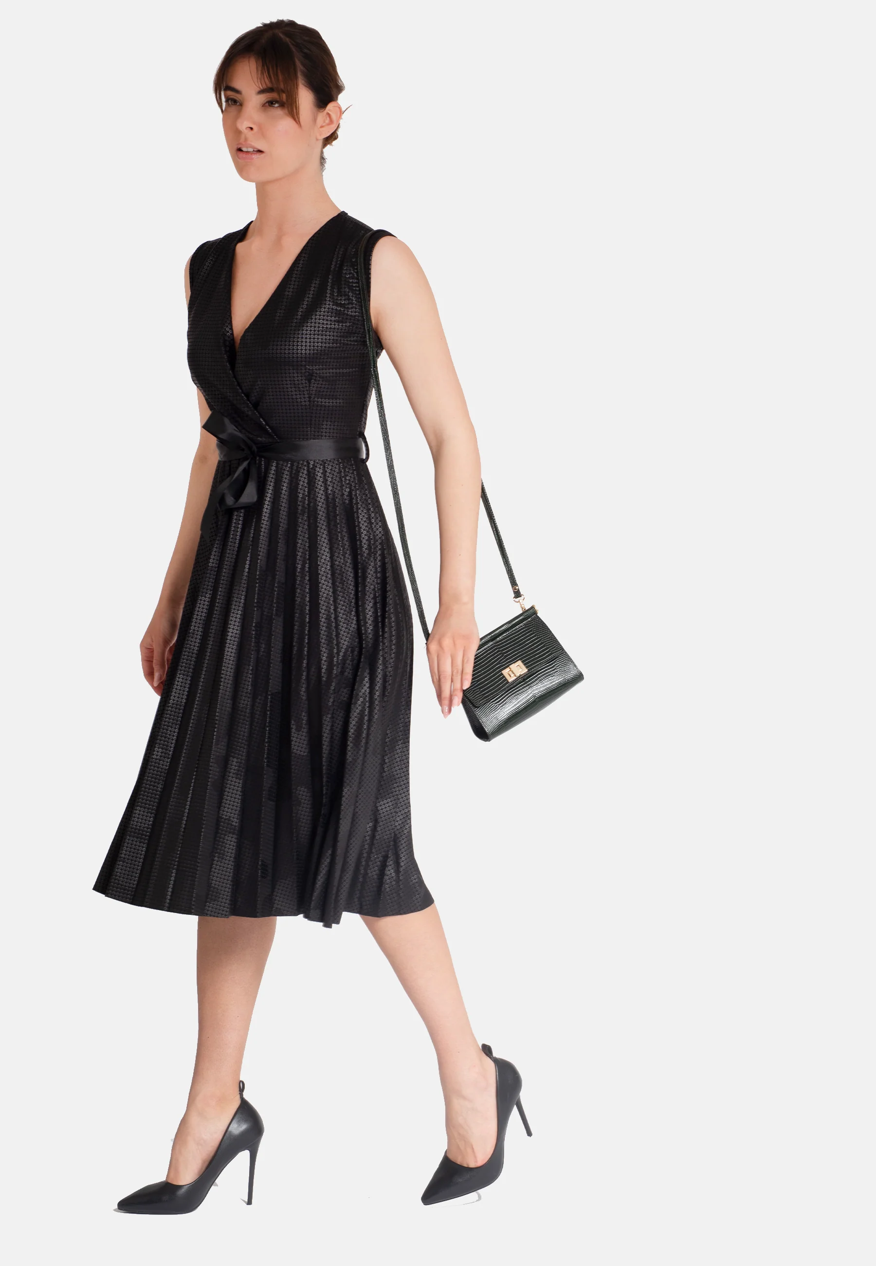 This stylish black messenger bag is crafted from high-quality synthetic leather, featuring a subtle textured design that adds a touch of sophistication. The sleek finish and the intricate texture offer a modern yet timeless look, making it a versatile accessory for both day and night outings.