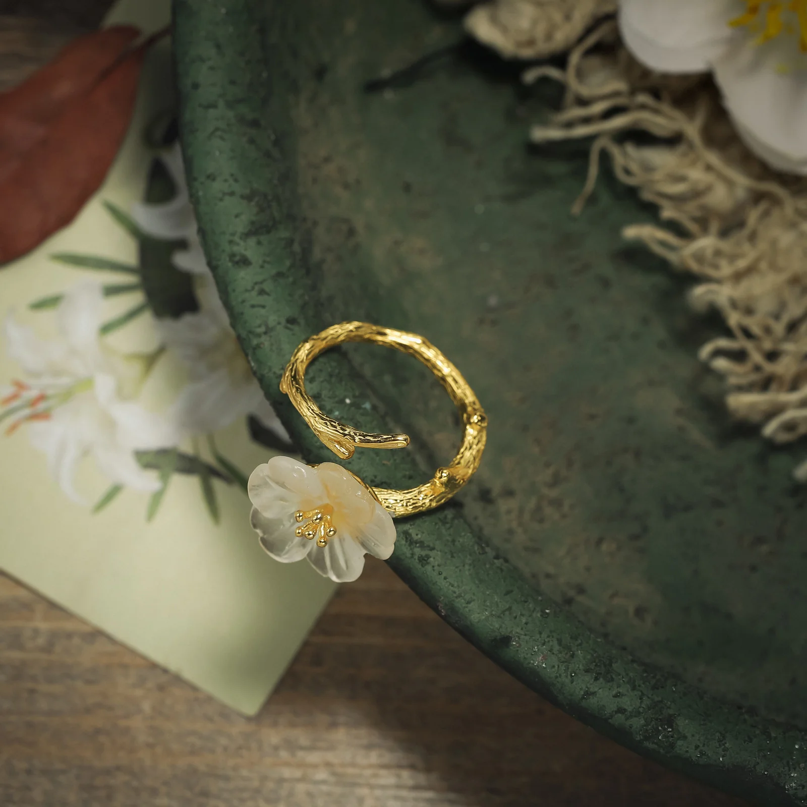The band of the ring mimics the texture of a slender branch, offering a unique, nature-inspired design. Constructed from durable alloy, the band is subtly coated to give a warm, golden tint, enhancing the organic aesthetics of the ring while ensuring comfort and longevity.
