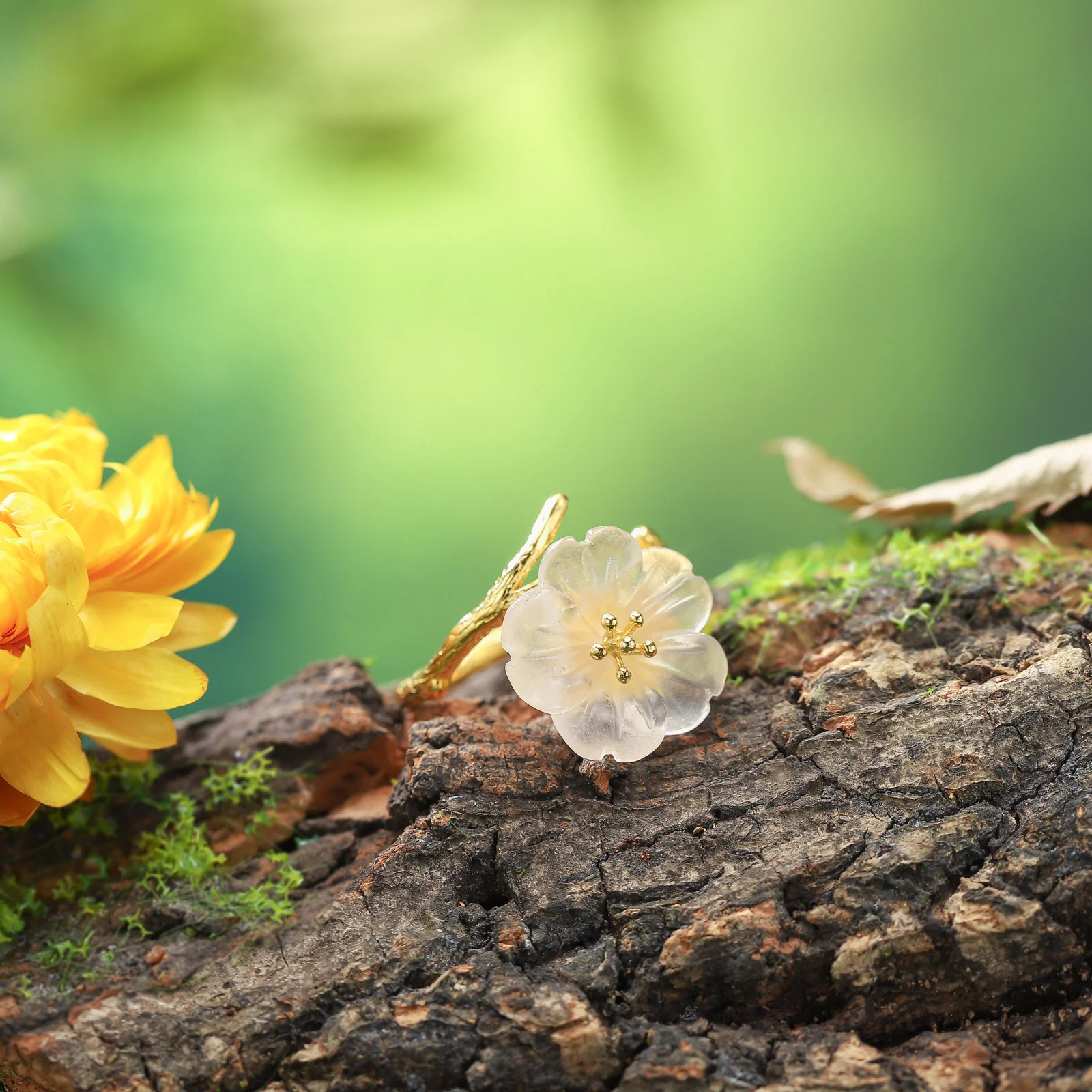 This beautiful ring combines the tenderness of nature with the elegance of craftsmanship. The central feature is a delicately crafted flower, made from high-quality resin. This translucent material gives the flower petal a charmingly soft and lifelike appearance, capturing light in a truly enchanting way.
